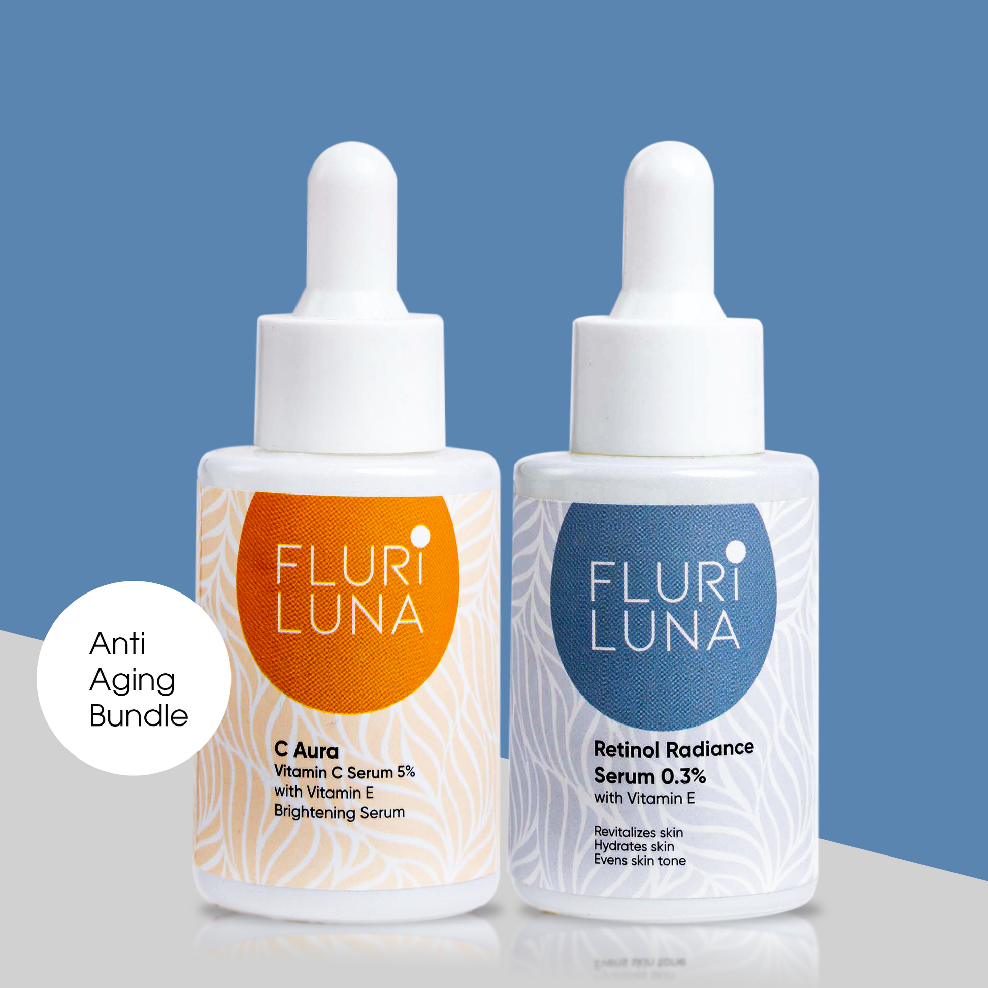 Turn back time with the FluriLuna Anti-aging Bundle, featuring our Vitamin C Serum and Retinol Radiance Serum. This powerful duo is designed to target signs of aging, from fine lines to uneven skin tone, while promoting a smoother, firmer, and more radiant complexion.